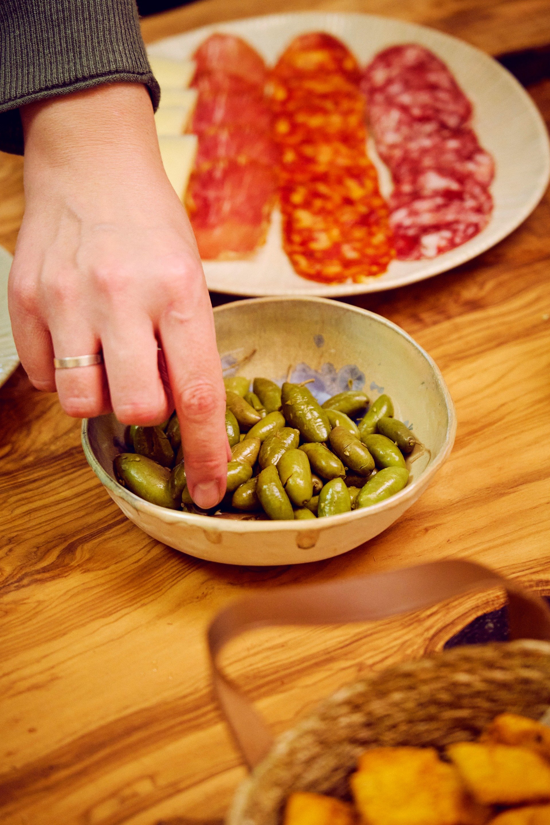 El ambiente es íntimo, distendido y elegante. Una copa en la mano, un picoteo con productos locales y el sonido del aceite fluyendo al fondo. Aquí, el tiempo parece detenerse y la noche se llena de matices verdes y dorados.